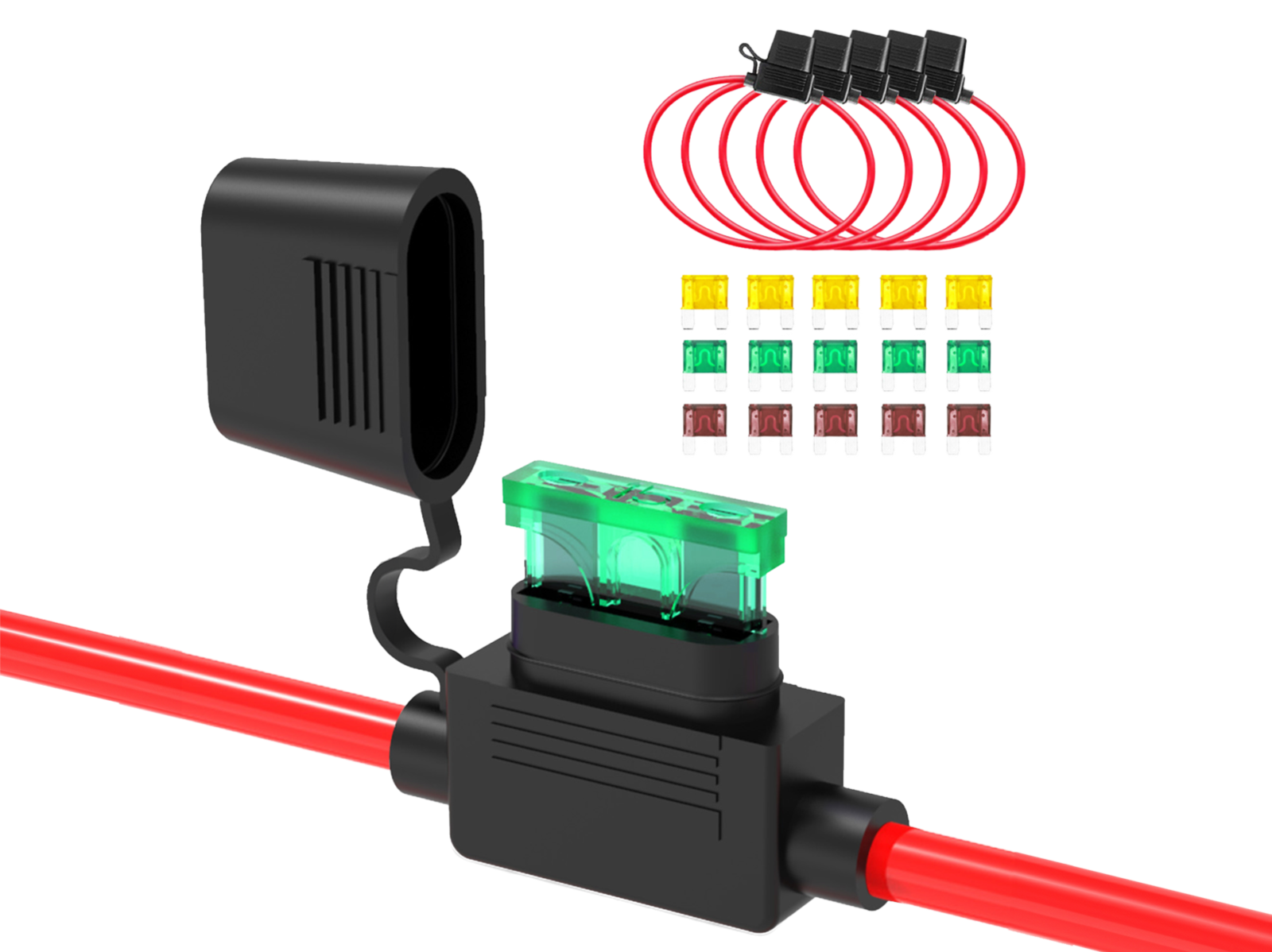 ATC/ATO inline zekeringhouders met zware 10 AWG rode stroomdraad, ontworpen om circuits