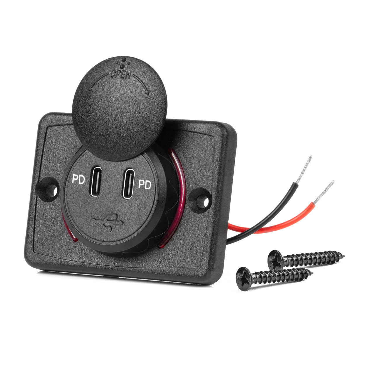 Vierkante waterdichte lader met rode LED-achtergrondverlichting, 2x USB C, 12/24V (64x48mm)